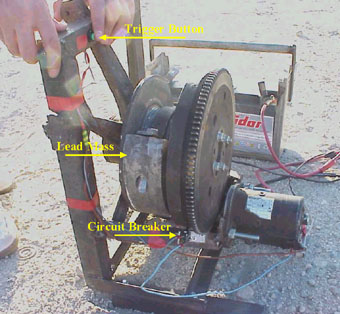 Fig.1: General view of the proposed S wave source. The mechanical wheel is coupled to a electrical DC motor. After the motor has been supplied with 24 Volts, by manual triggering on the green Button, the device is immediately stopped by a electro-mechanic circuit breaker thus generating a short duration impulse. The asymmetric placement of the lead mass potentiates the shear impulse through the soil/source coupling and dampens the system after the torque is applied. The picture depicts the final position of the wheel and the lead mass.