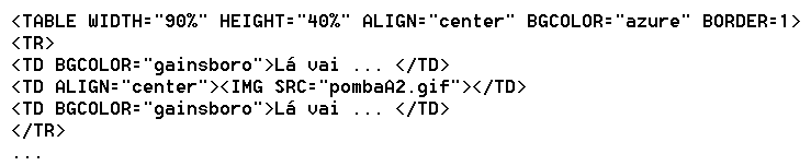 Os atributos de uma tabela incluem as suas dimensões (altura e largura), côr do fundo, espessura da margem, alinhamento, ... Dimensões, cores e alinhamentos podem tambem ser atribuídos a cada elemento da tabela.